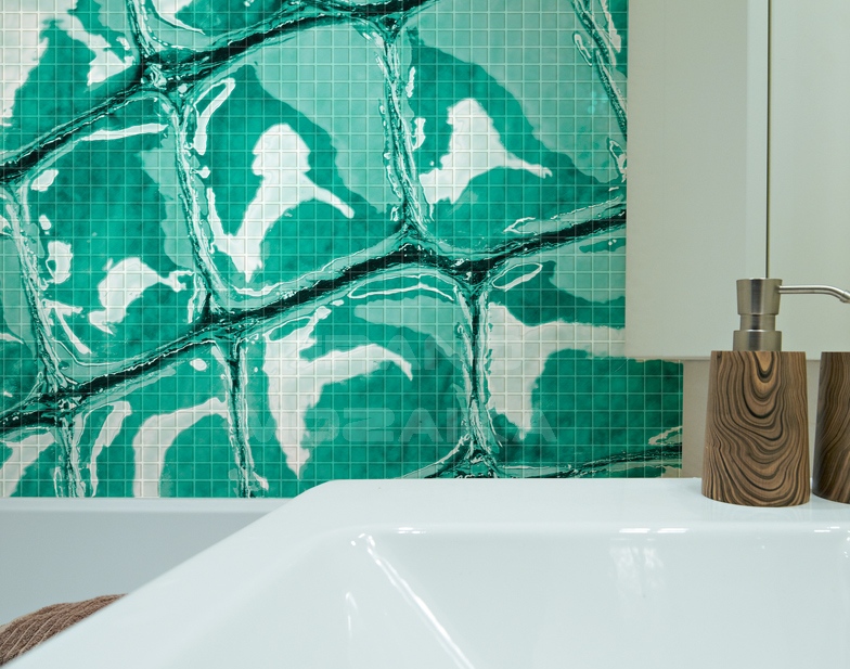 Материал не впитывает воду, что позволяет широко использовать его в отделке ванных комнат, душевых, кухонь, бассейнов и других влажных помещений.