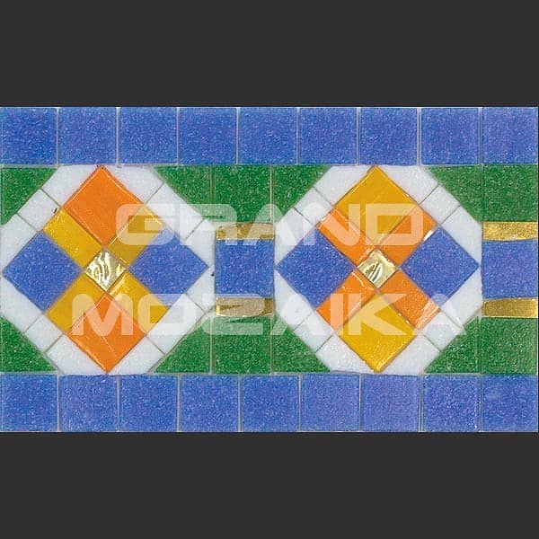 Матричный бордюр из коллекции для бассейнов Alma выполнен из небольших глянцевых кусочков. Бордюр украшен необычным геометрическим рисунком голубого, зеленого, желтого и оранжевого цвета.Такой бордюр будет прекрасно смотреться в дизайне бассейна в сочетаниями со стеклянными мозаиками из других серий.