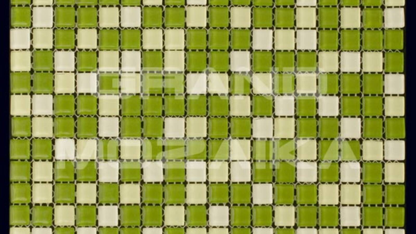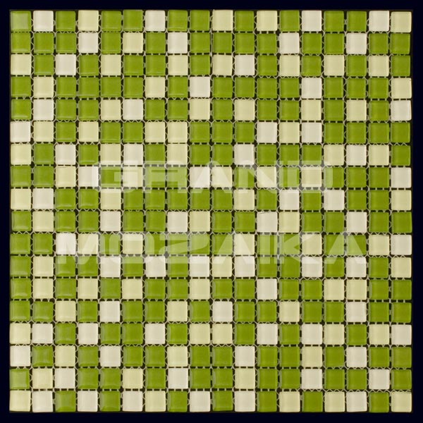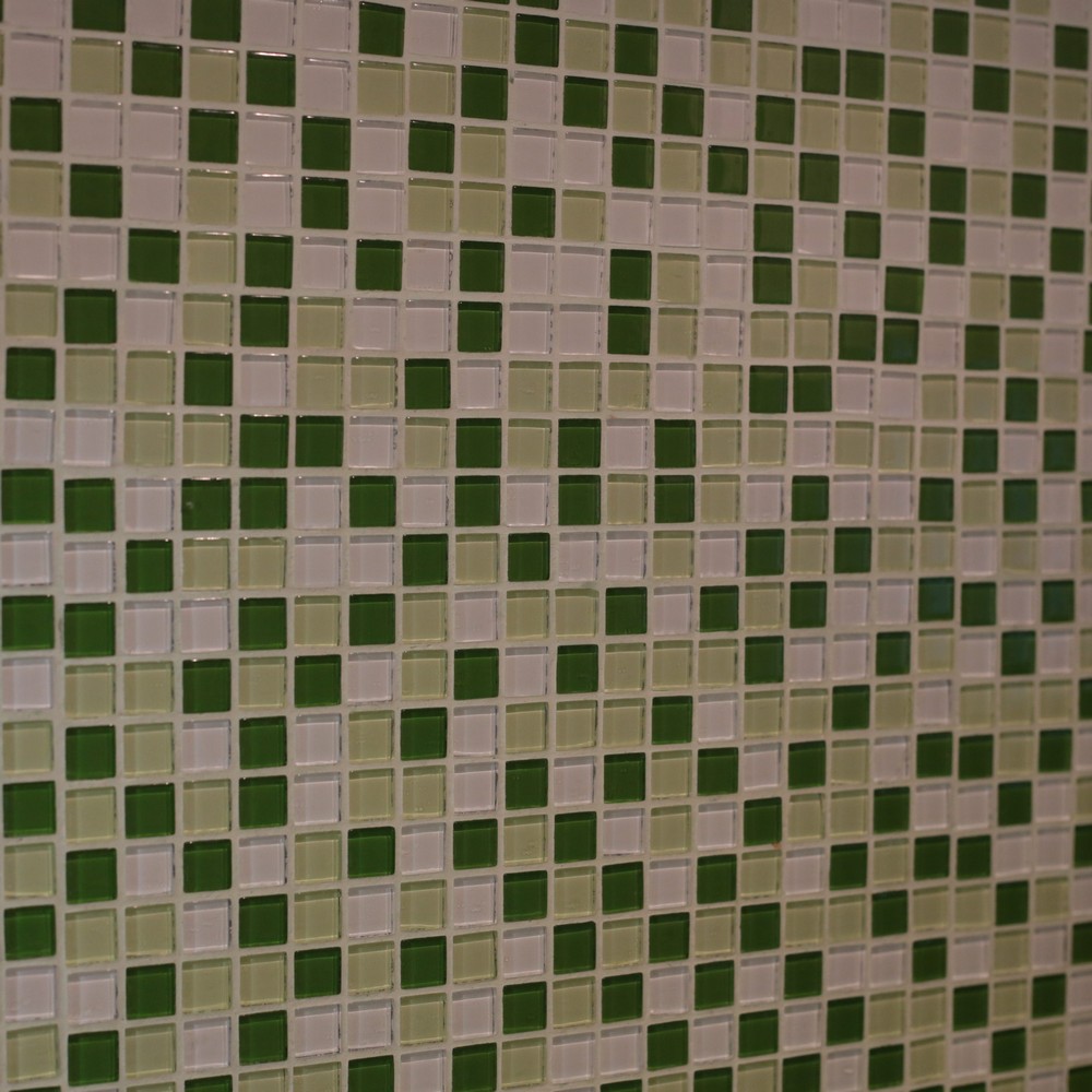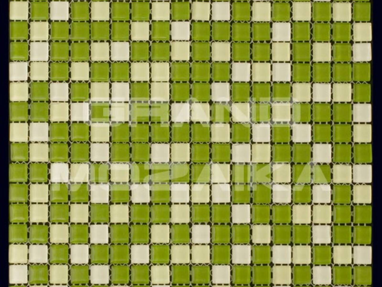 Стеклянная мозаика зеленого цвета серии Mix. Состоит из мелких (15х15 мм) кусочков светло-зеленого и насыщенно-зеленого цвета. Идеально подходит для отделки ванных комнат и других помещений. Поверхность глянцевая, размер сетки 295х295 мм. Толщина мозаики - 4 мм.