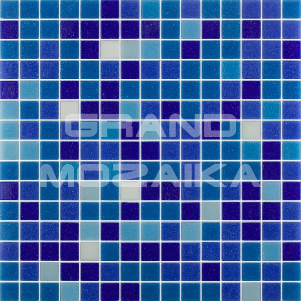 Мозаика для бассейнов серии Растяжки состоит из кусочков размером 20х20 мм голубого и синего цвета. Изредка встречающиеся мозаичные кусочки белого цвета разбавляют общую голубую гамму. Полотно размером 327х327 мм легко крепится к поверхности, что не требует особых навыков.