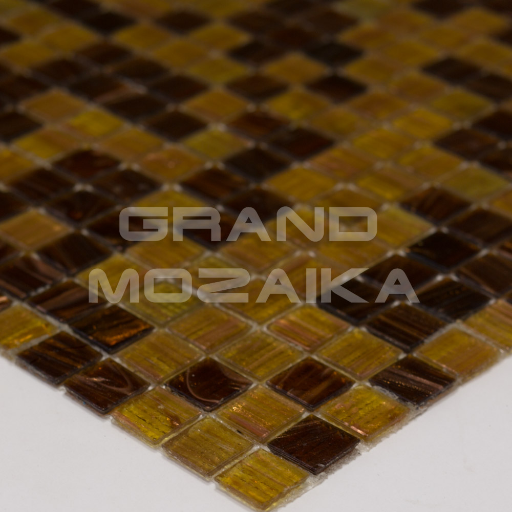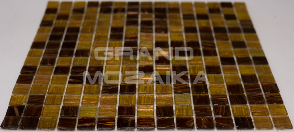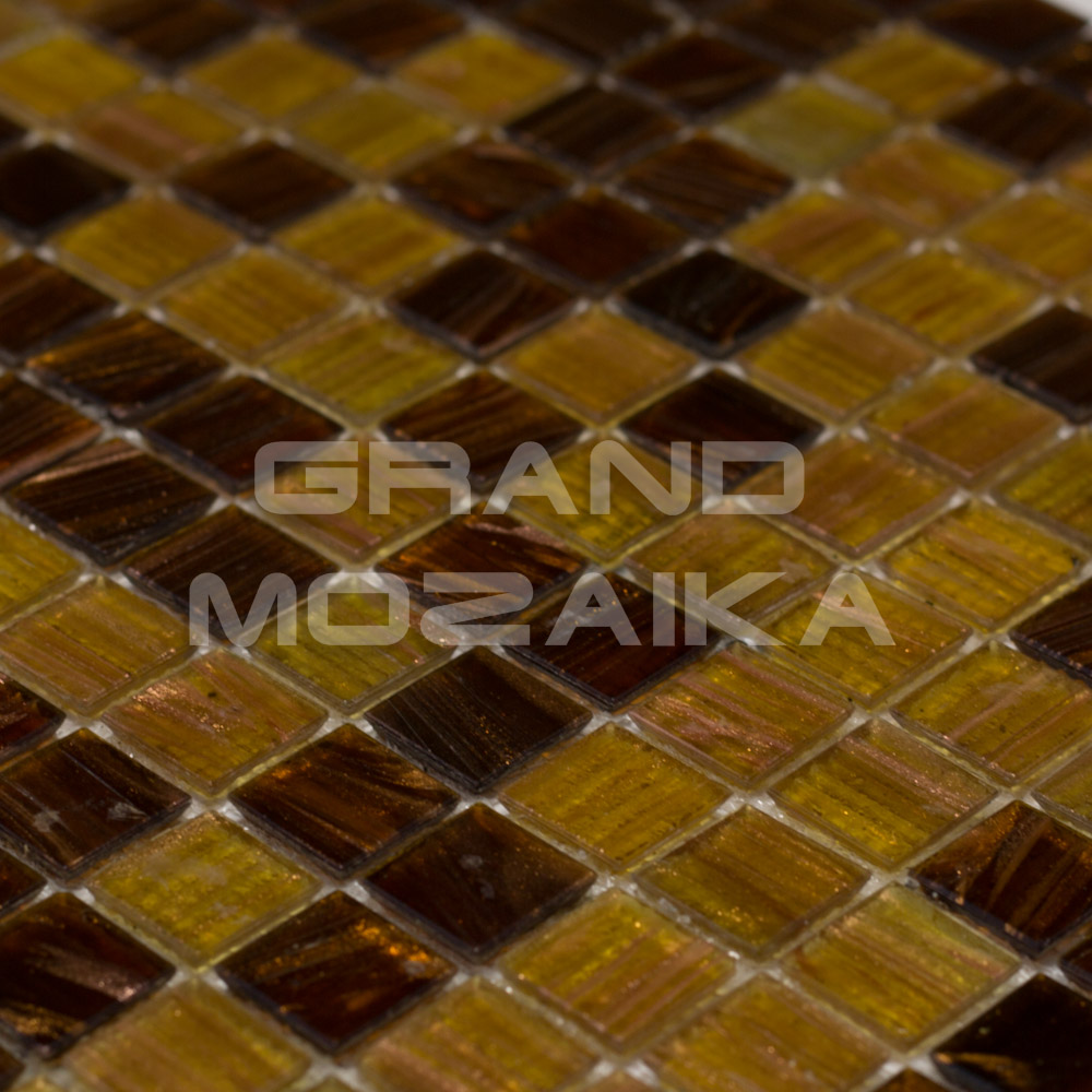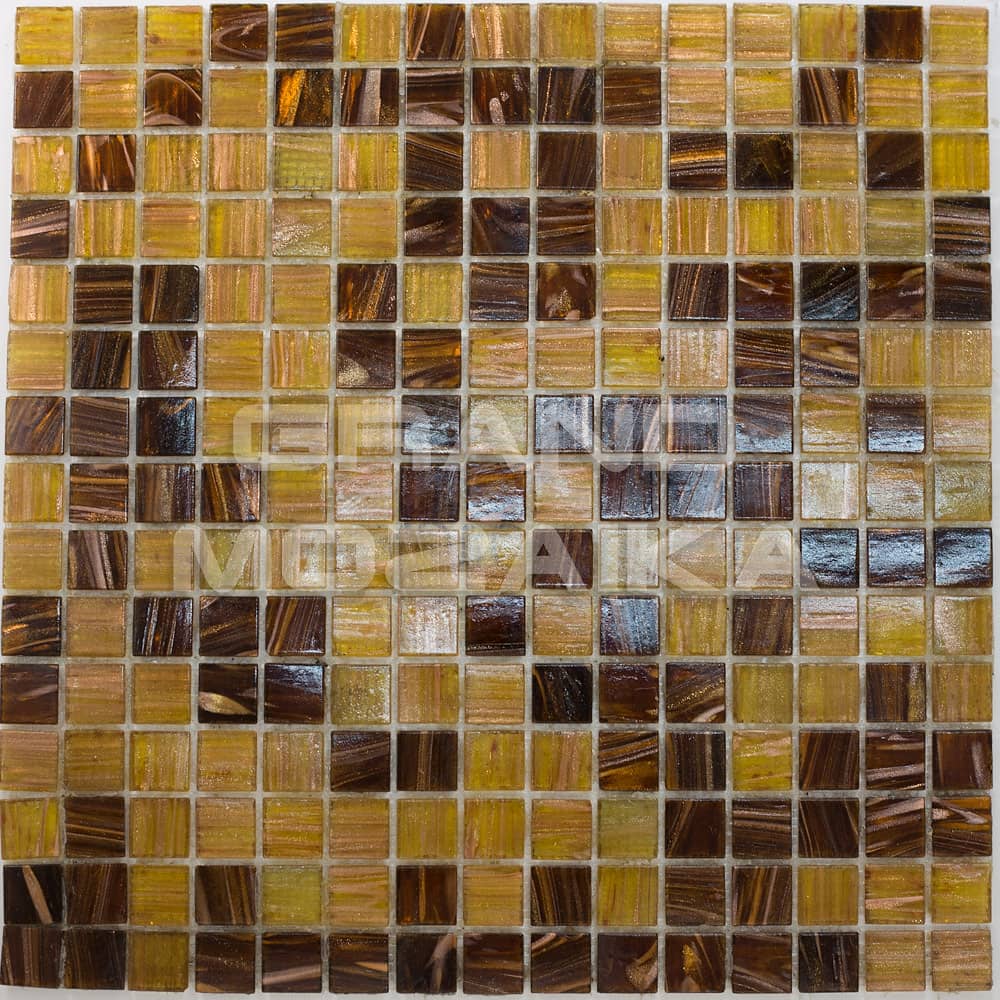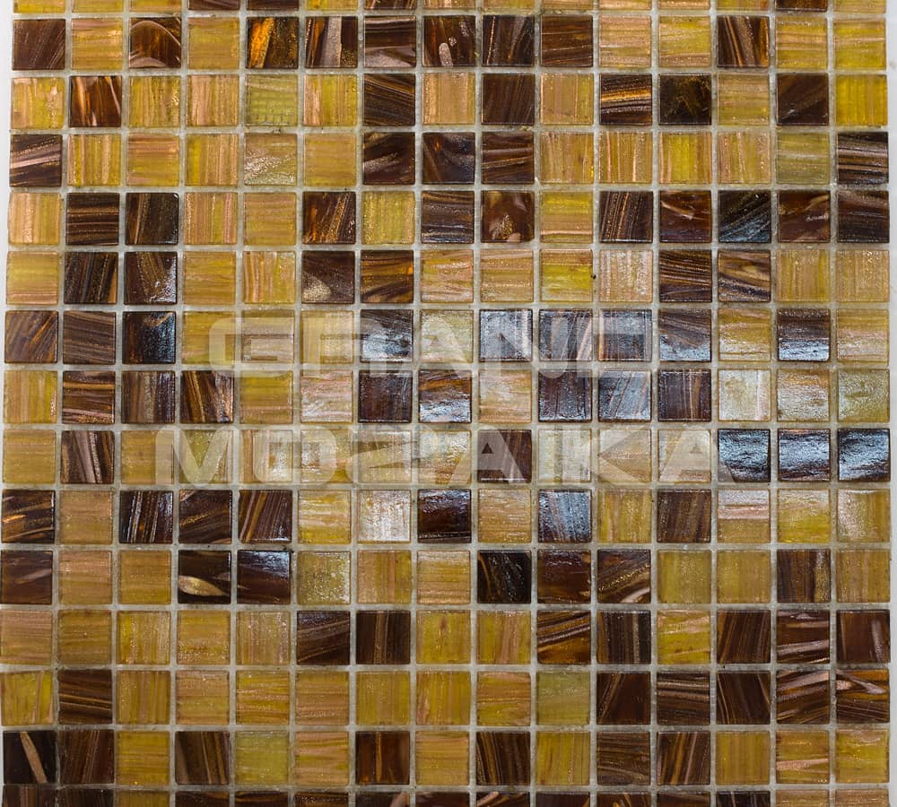 Стеклянная мозаичная плитка серии Смеси. Цвета - темно-коричневого и желтого с золотыми разводами. Контраст темного и светлого выгодно подчеркнет уникальность вашего декора, а золотые вкрапления придадут неповторимый блеск поверхности. Размер чипа 20х20 мм, толщина 4 мм. Размер листа 327х327 мм. Теплые земляные оттенки этой мозаичной смеси великолепно будут сочетаться в интерьере с деревом, золотом и бронзой.