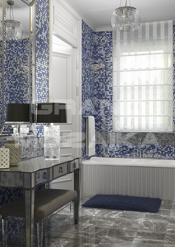 Стеклянная мозаика синего цвета серии Ice Flowers. Состоит из мелких (23,5х23,5 мм) кусочков. Оригинальное сочетание синих оттенков с контрастными светлыми добавляет полотну объем и изысканность. Идеально подходит для отделки ванных комнат и других помещений. Поверхность глянцевая, размер сетки 300х300 мм. Толщина мозаики - 8 мм.