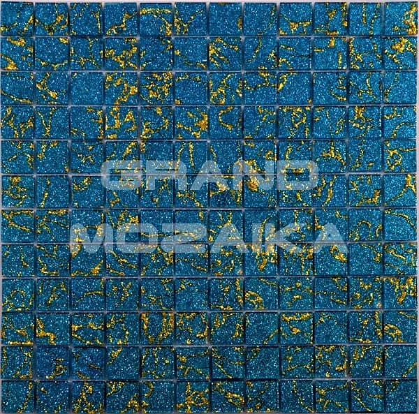 Шикарная мозаика из стекла серии Exclusive ярко-синего цвета с золотыми узорами-разводами и белыми вкраплениями придаст Вашему интерьеру роскошь и изящество. Плитки размером 23х23х4 мм. Полотно размером 300х300 мм легко в монтаже. Мозаика, благодаря драгоценному золотому блеску, любое помещение превратит в праздничное и нарядное.