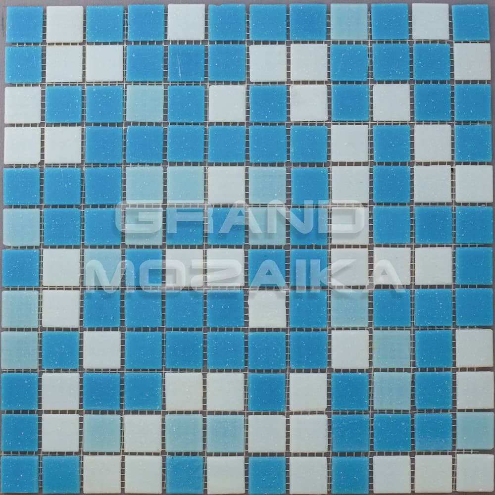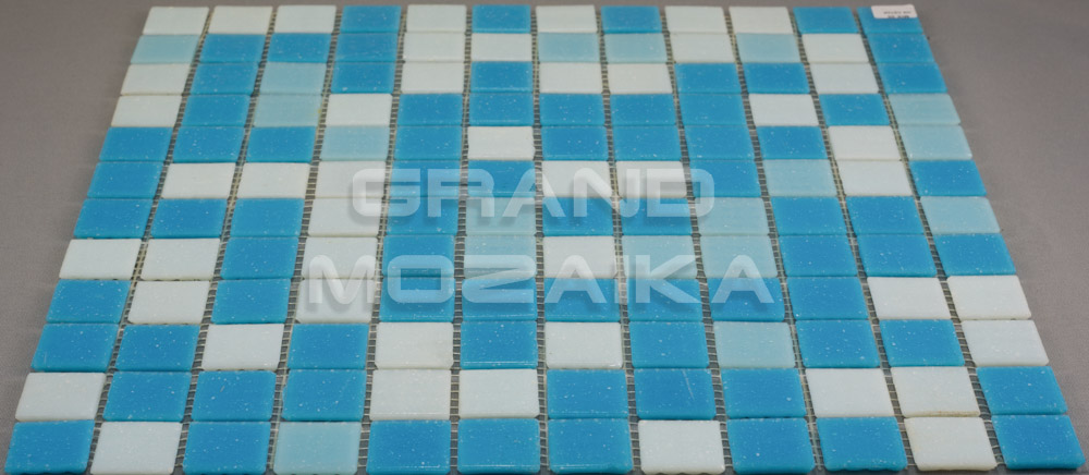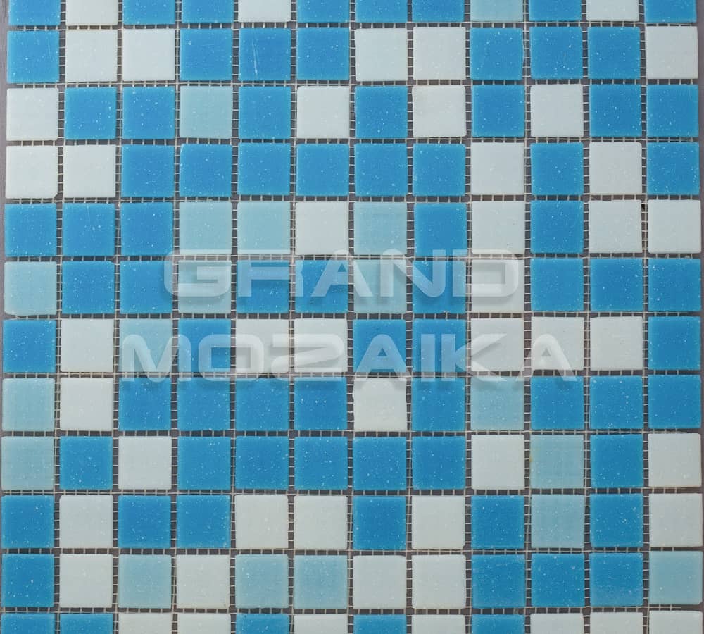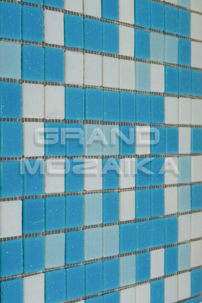 Стеклянная мозаика серии Econom состоит из чипов белого и голубого цвета размером 25х25 мм. Основа мозаики - сетка, прикрепленная с обратной стороны листа. Мозаика микс отлично подойдет для облицовки бассейнов, а также декора ванных и душевых комнат, саун.