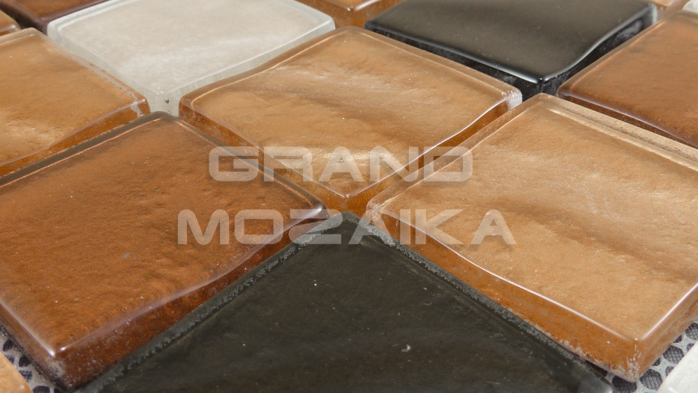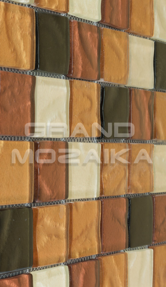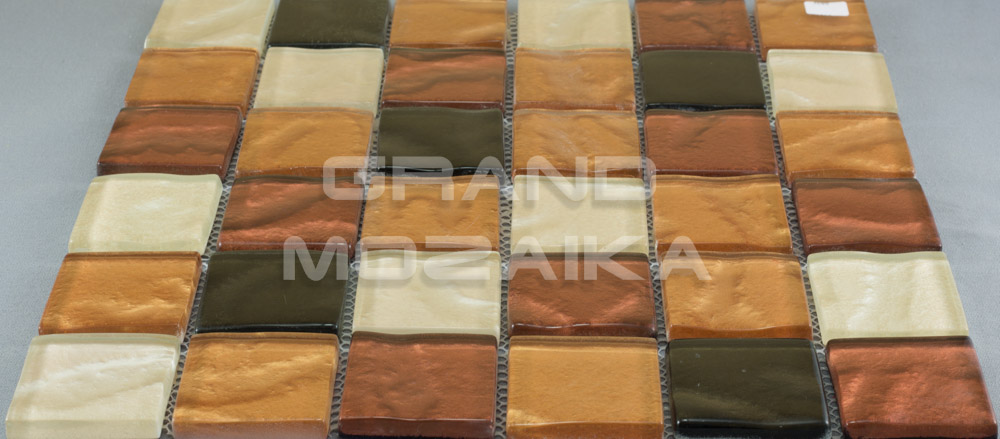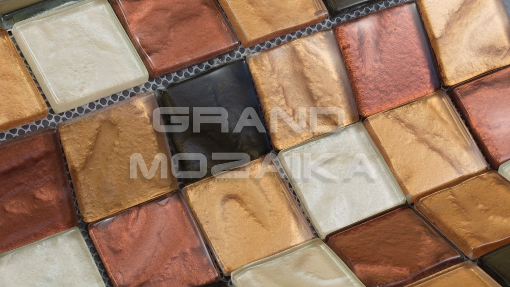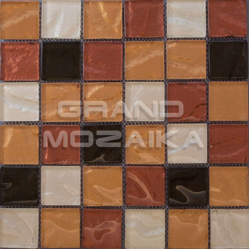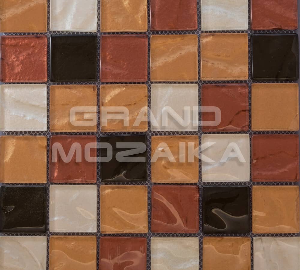 Стеклянная мозаика собрана из чипов серого, бежевого, бордового и коричневого цвета в равных пропорциях. Размер чипов 48х48 мм. Прекрасно подойдет для декора современных стильных интерьеров. Поверхность глянцевая, размер сетки 298х298 мм. Толщина мозаики - 8 мм.