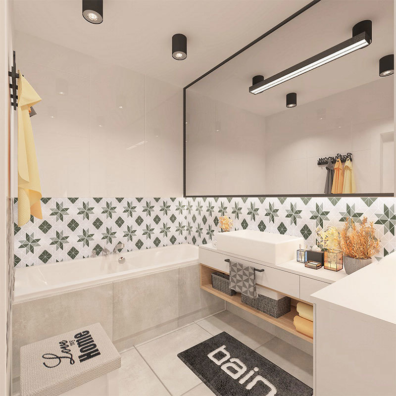 - Применение: для отделки внутри помещений, для душевой кабины и ванной комнаты, для кухни, для пола (малая проходимость)
