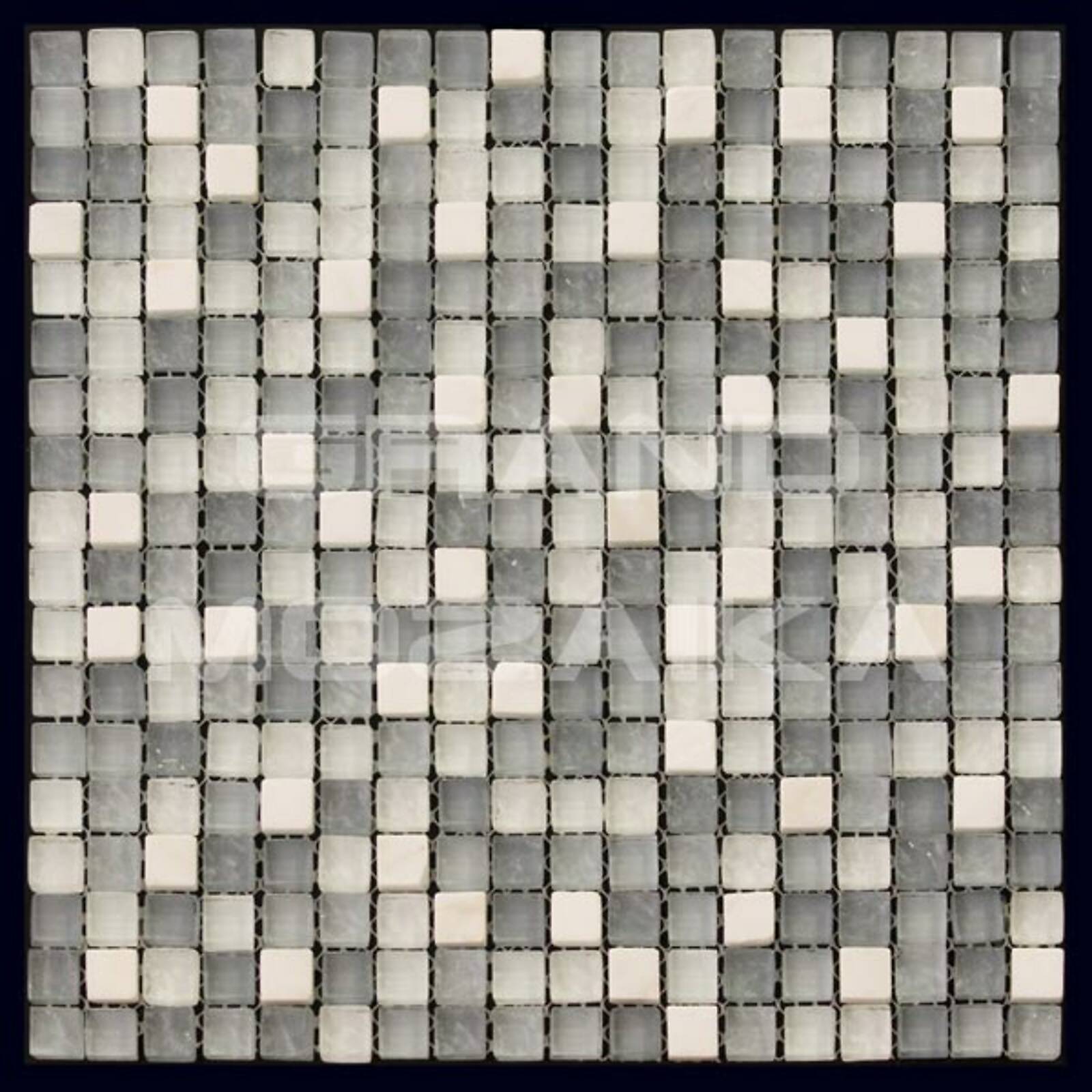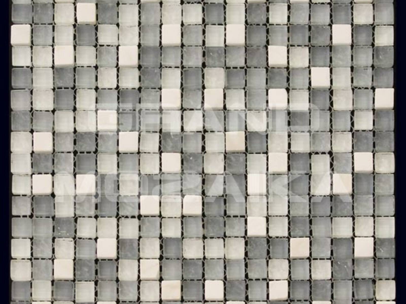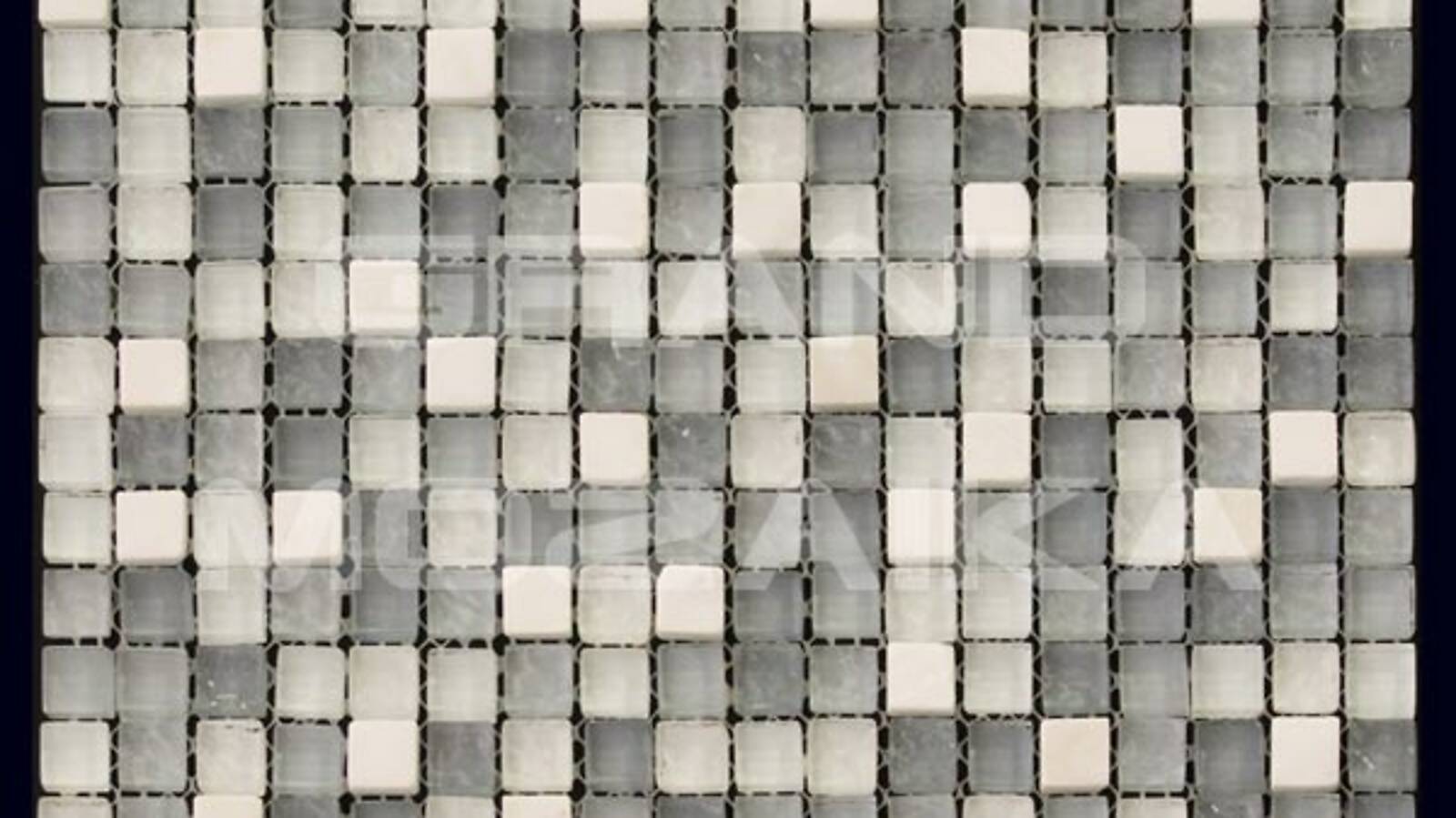Микс мозаика серии Mix Glass&Stone состоит из маленьких кусочков размером 15х15 мм. Полотно размером 300х300 мм состоит из стеклянных и каменных мозаик различных оттенков серого цвета. Такая мозаика послужит оригинальным дополнение любого интерьера.