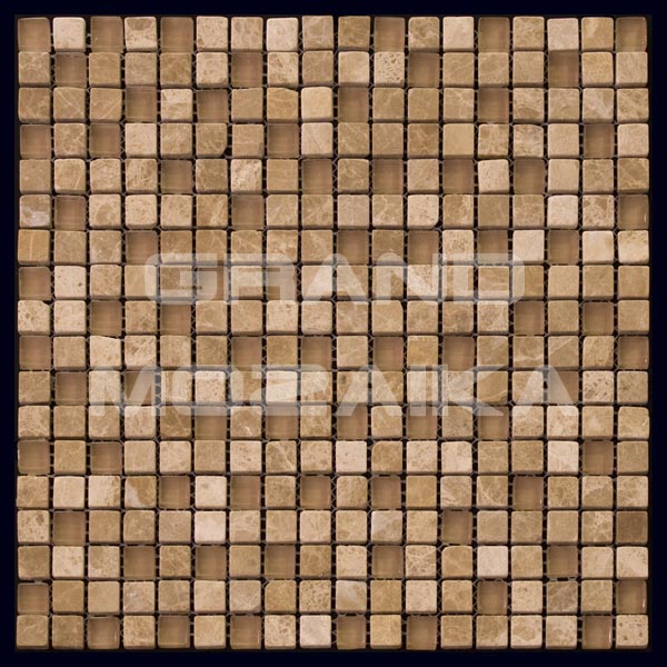 Микс мозаика серии Mix Glass&Stone состоит из маленьких кусочков размером 15х15 мм. Полотно размером 298х298 мм состоит из стеклянных и каменных мозаик различных оттенков светло-коричневого цвета. Такая мозаика послужит оригинальным дополнение любого интерьера.