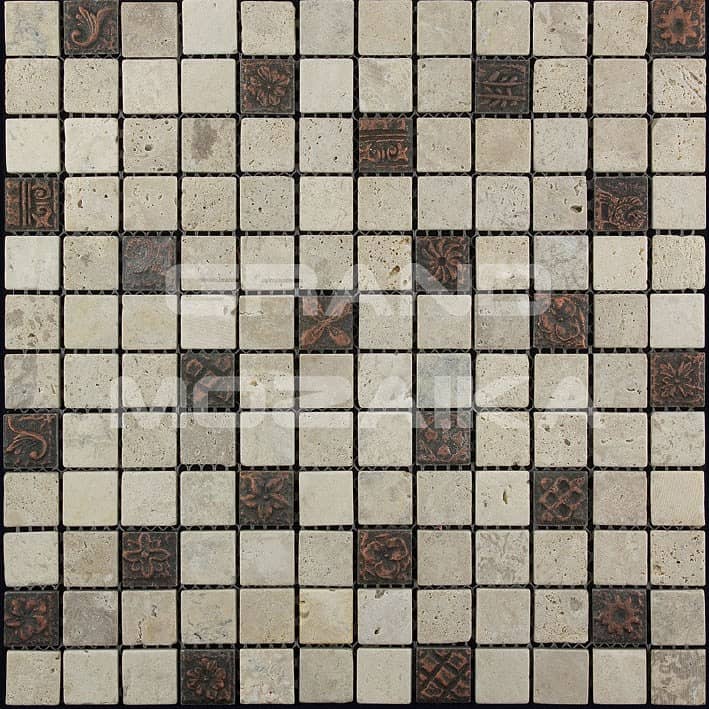 Элитная мозаика Luxury серии Inka состоит из кусочков размером 23х23 мм. Полотно выполнено из мозаик приглушенного светло-серого и коричневого цвета. Вкрапление мозаик с незамысловатым орнаментом делает полотно оригинальным. Интерьер дополненный такой мозаикой окунет вас в анналы древности.