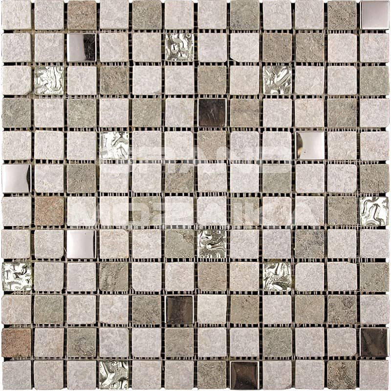 Микс мозаика серии Mix Stone&Glass&Metall состоит из маленьких кусочков размером 22х22 мм. На полотне размером 300х300 мм хаотически сочетаются стеклянные, каменные и металлические мозаики серого оттенка. Такая мозаика послужит оригинальным дополнение любого интерьера.