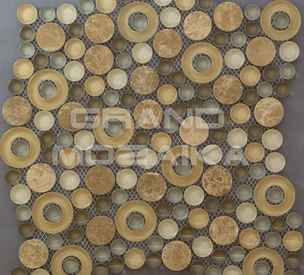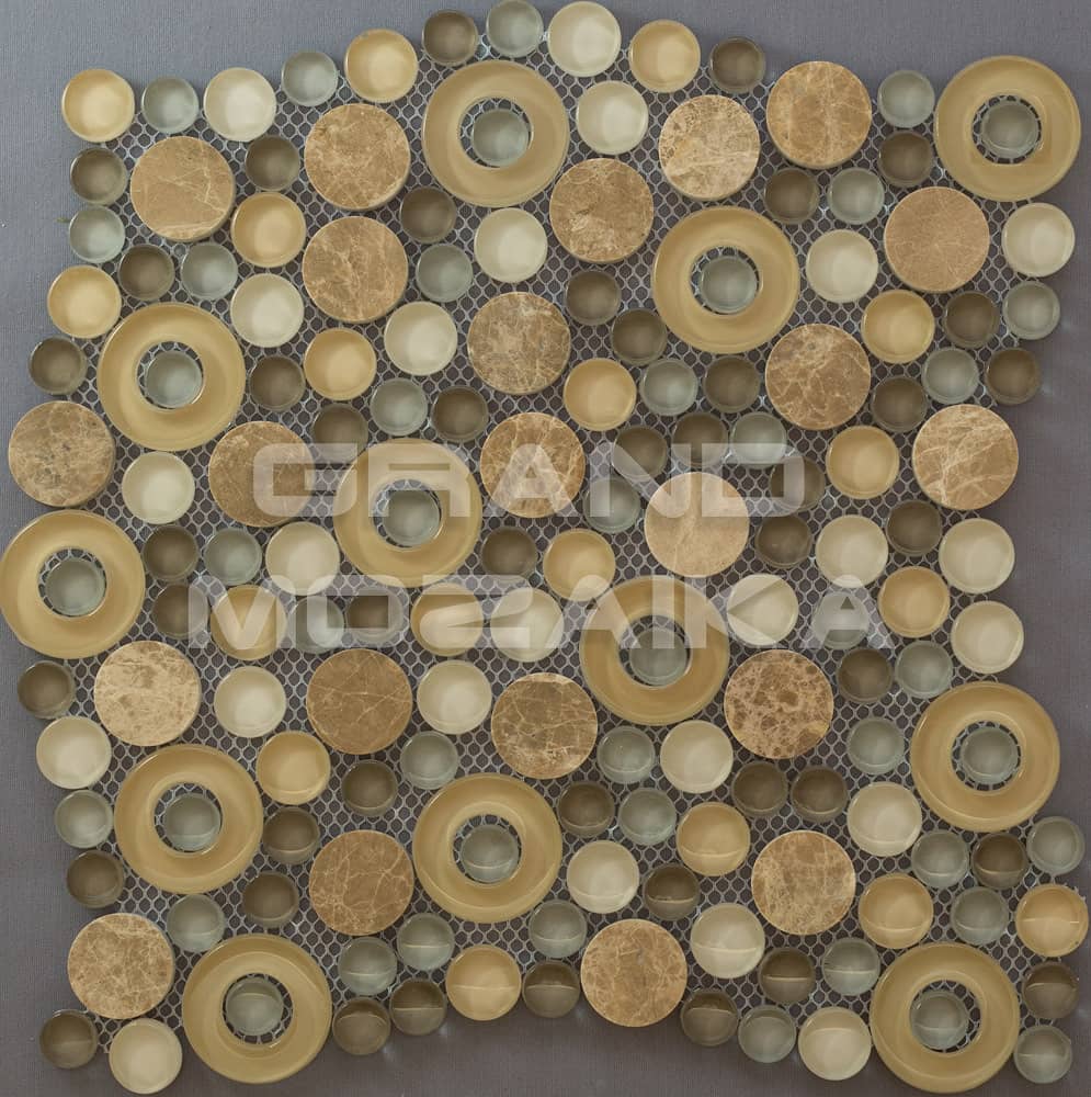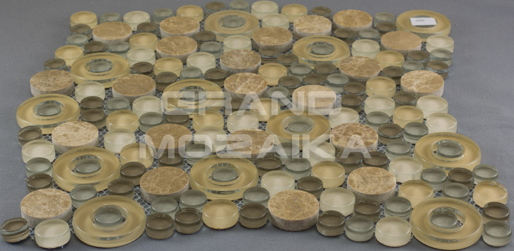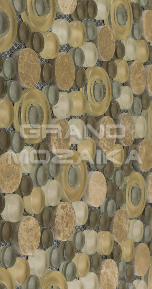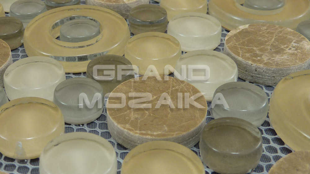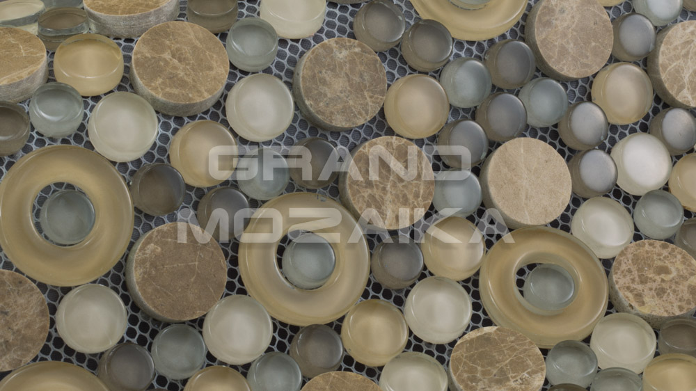 Мозаика микс из стекла и камня состоит из модулей округлой формы. Каменные и стеклянные, бежевые и серебристые, прозрачные и полупрозрачные, с отверстием и сплошные - все эти плитки сочетаются в одном неповторимом мозаичном полотне размером 300х300 мм. Толщина мозаики 8 мм. Мозаика, оправдывая название своей серии - Exclusive, сделает помещение по-настоящему роскошным и дорогим.