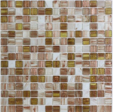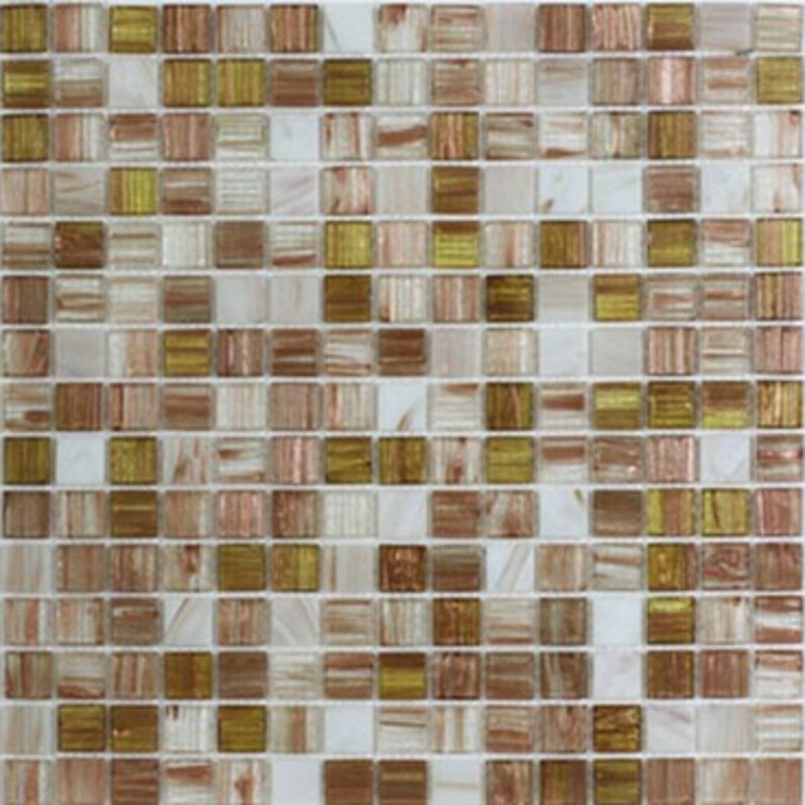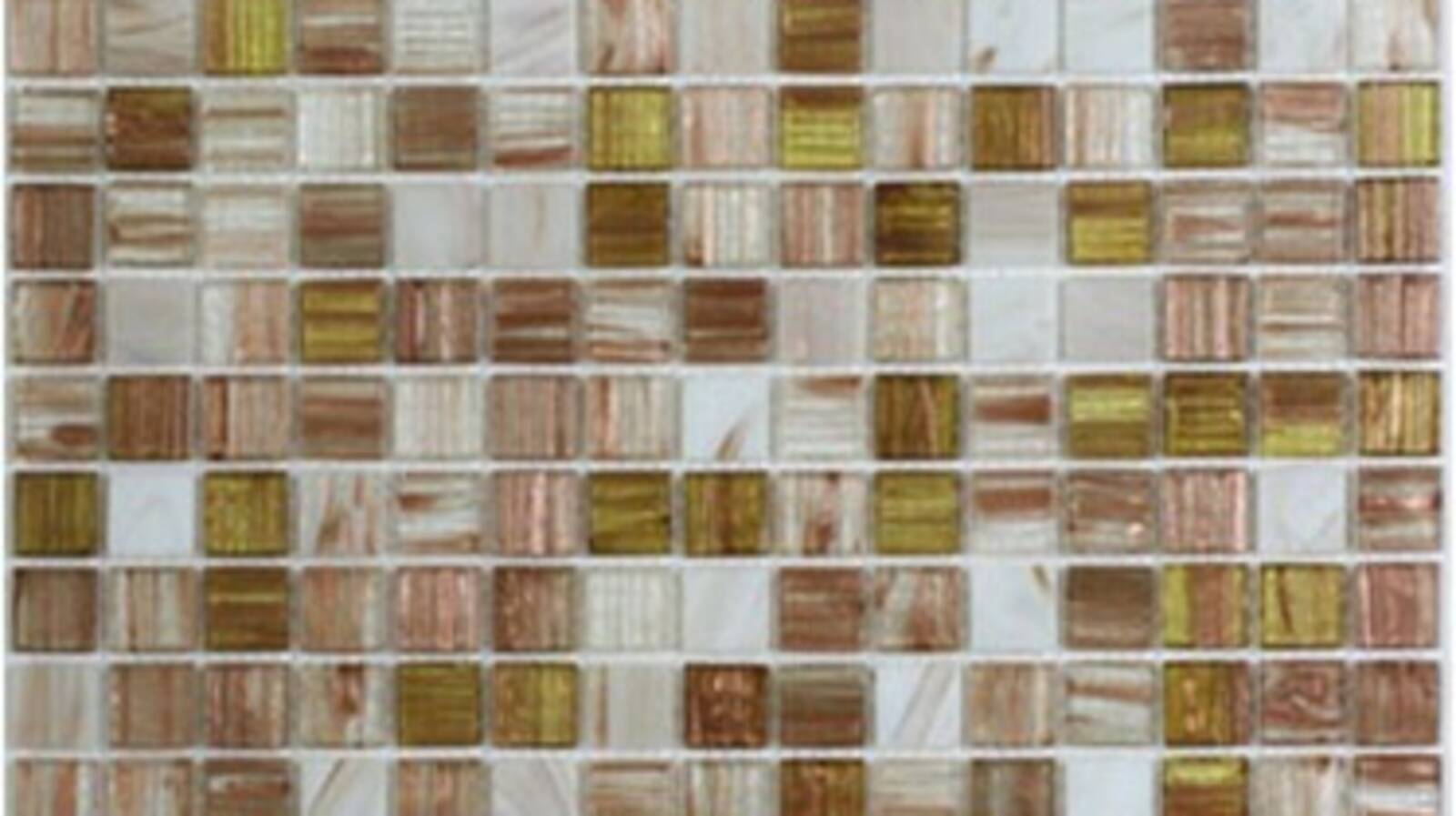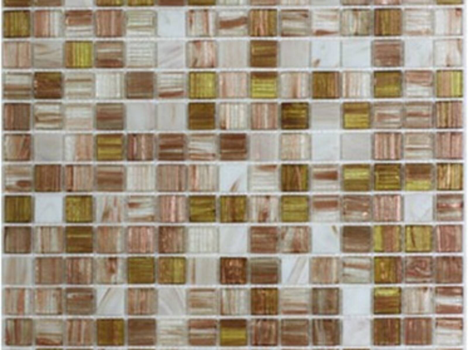 Мозаика для бассейнов серии Смеси из кусочков размером 20х20 см. Полотно 327х327 легко в монтаже и не требует особых навыков. Бело-бежевая мозаика в сочетании с коричневыми кусочками напоминает мрамор своим размытым рисунком. Элементы из красного золота добавляют роскоши в палитру. Такое полотно украсит любой бассейн и подойдет как для внутренней его отделки так и для внешней.