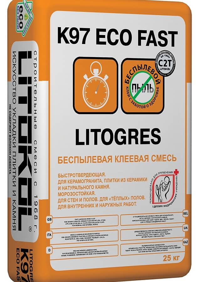 LITOGRES K97 ECO FAST — эластичная клеевая смесь на цементной основе, обладающая высокими адгезивными свойствами и предназначенная для укладки плитки из керамогранита, керамики, клинкера, натурального камня с устойчивой структурой, как на стабильные основания, так и на основания подверженные деформации. LITOGRES K97 ECO FAST применяется при облицовке стен и полов, «тёплых» полов, крытых балконов и террас, бетонных лестниц. Для внутренних работ.