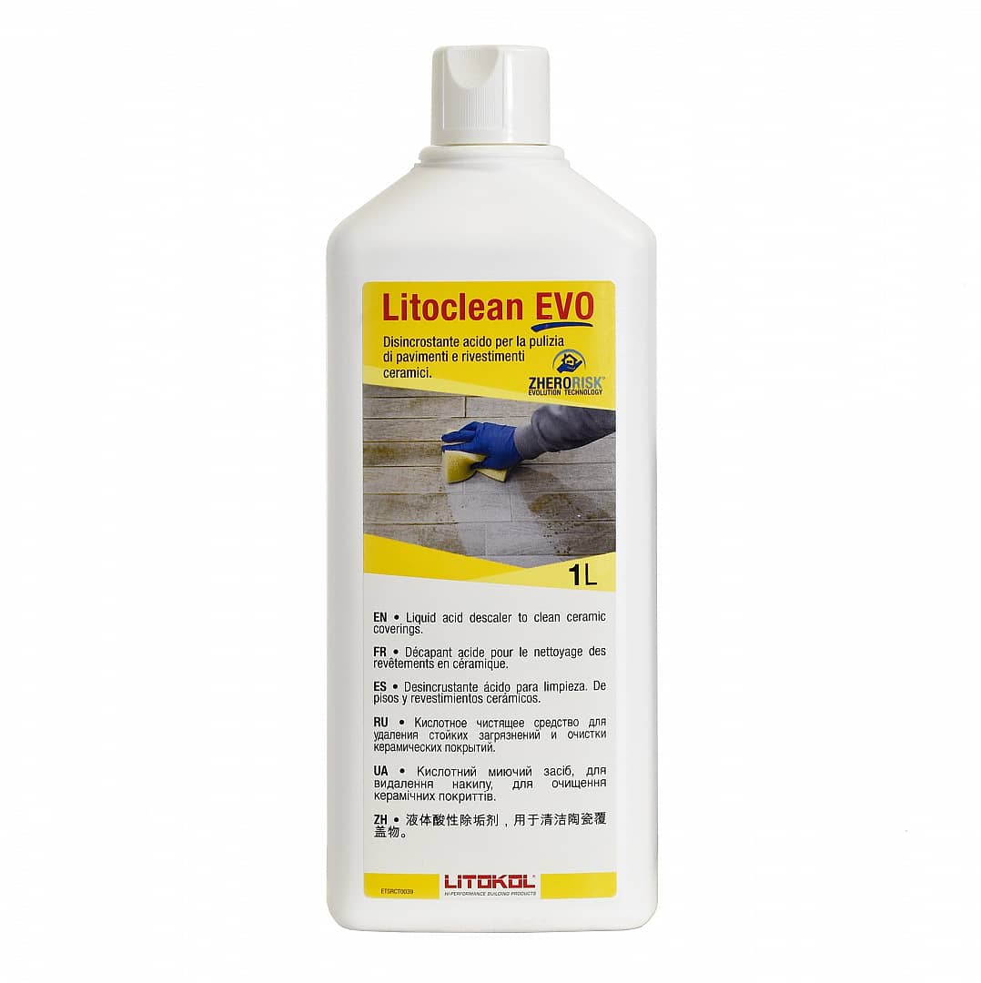 При очистке поверхностей из керамогранита и кислотоустойчивой плитки, рекомендуется разводить LITOCLEAN EVO с водой в соотношении 1:1.