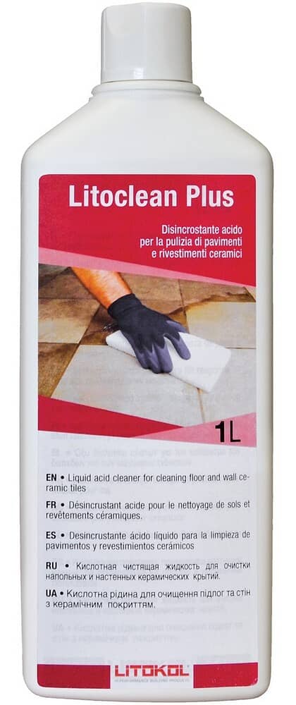 • При очистке поверхностей из керамогранита и кислотоустойчивой плитки, рекомендуется разводить LITOCLEAN PLUS с водой в соотношении 1:1.
