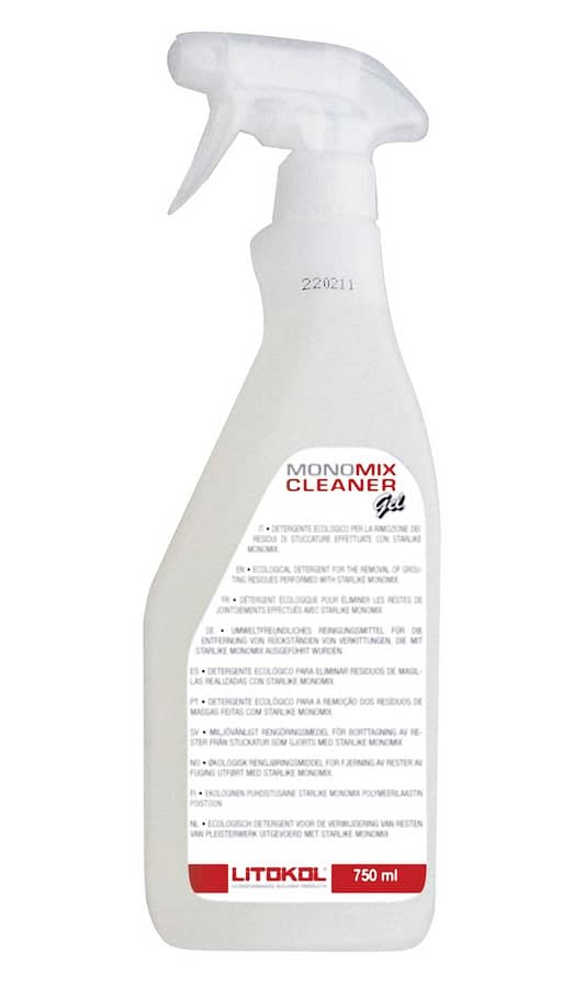 Удаление возможных прозрачных разводов с поверхности керамики и мозаики, образованных в результате смолистого плёнкообразования, характерного для полимерного раствора STARLIKE®MONOMIX, должно быть выполнено нейтральным ГЕЛЬ-ОЧИСТИТЕЛЕМ MONOMIX не позднее, чем через 24 часа после затирки. Нанести неразбавленный продукт на поверхность, оставить на несколько минут, затем протереть белым войлоком (арт. 109 / G), вытереть влажной губкой и высушить поверхность чистой тканью. Рекомендуется применять ГЕЛЬ-ОЧИСТИТЕЛЬ MONOMIX на небольшую площадь поверхности (около 1-2 м²), чтобы не оставлять средство в контакте с затертыми швами более 5-7 минут