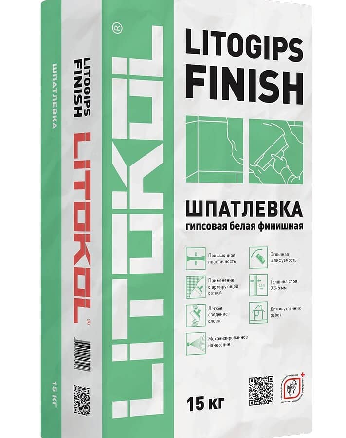 LITOGIPS FINISH - сухая шпаклёвочная смесь на основе гипсового вяжущего, инертных наполнителей и специальных органических добавок. Продукт отличают следующие свойства: