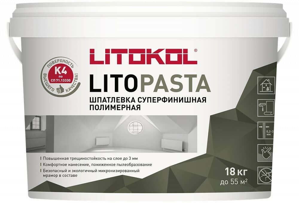 LITOPASTA - полимерная шпатлевка белого цвета для суперфинишного выравнивания минеральных оснований внутри помещений слоем от 0,2 до 3 мм за одно нанесение. Продукт обладает следующими свойствами: