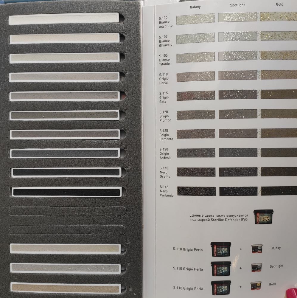 В STARLIKE EVO используется цветные кварцевые микросферы собственного производства что позволяет осуществлять контроль качества производственного процесса от исходного сырья до готового продукта. Чрезвычаино мелкая гранулометрия цветных микросфер позволяющая получить абсолютно гладкую поверхность межплиточного шва.