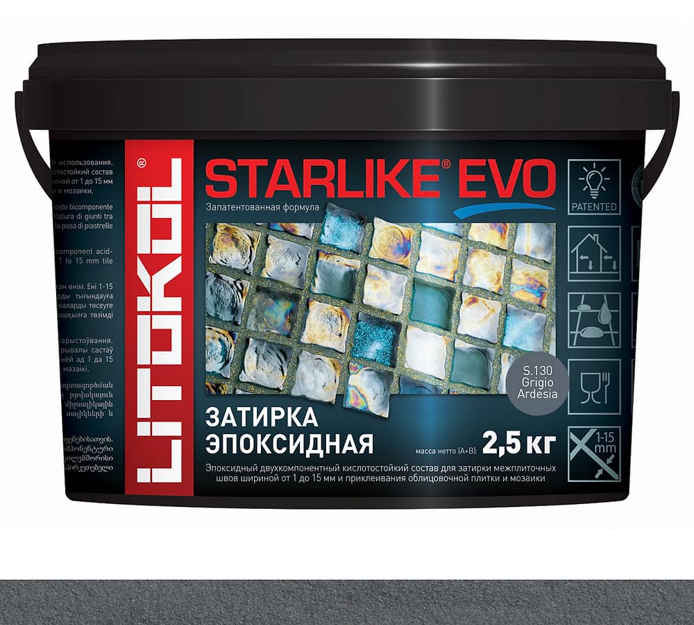 STARLIKE EVO двухкомпонентныи эпоксидныи кислотостоикии, щелочестоикии состав для затирки межплиточных швов с ширинои шва от 1 до 15 мм и использования в качестве клея для всех видов облицовочнои плитки и мозаики.