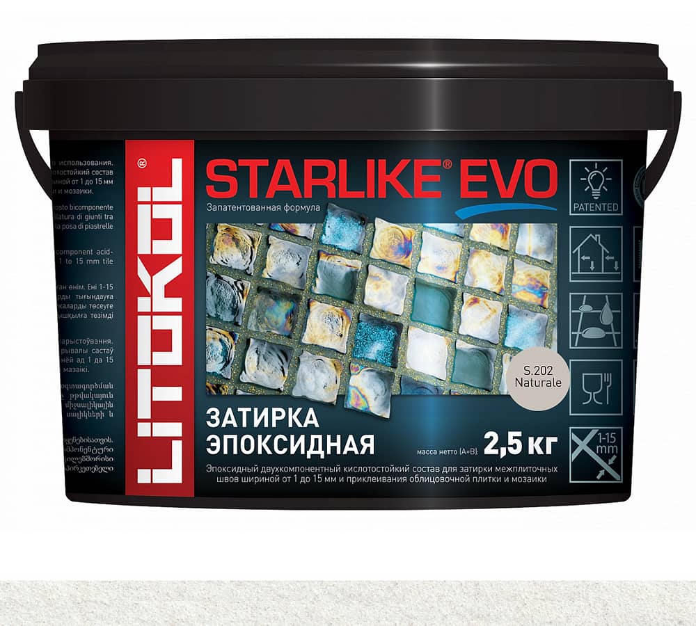 STARLIKE EVO единственная в мире запатентованная эпоксидная затирка. При нанесении STARLIKE EVO не дает эффекта прокрашивания на керамическои плитке, мозаике, плитке из натурального камня.