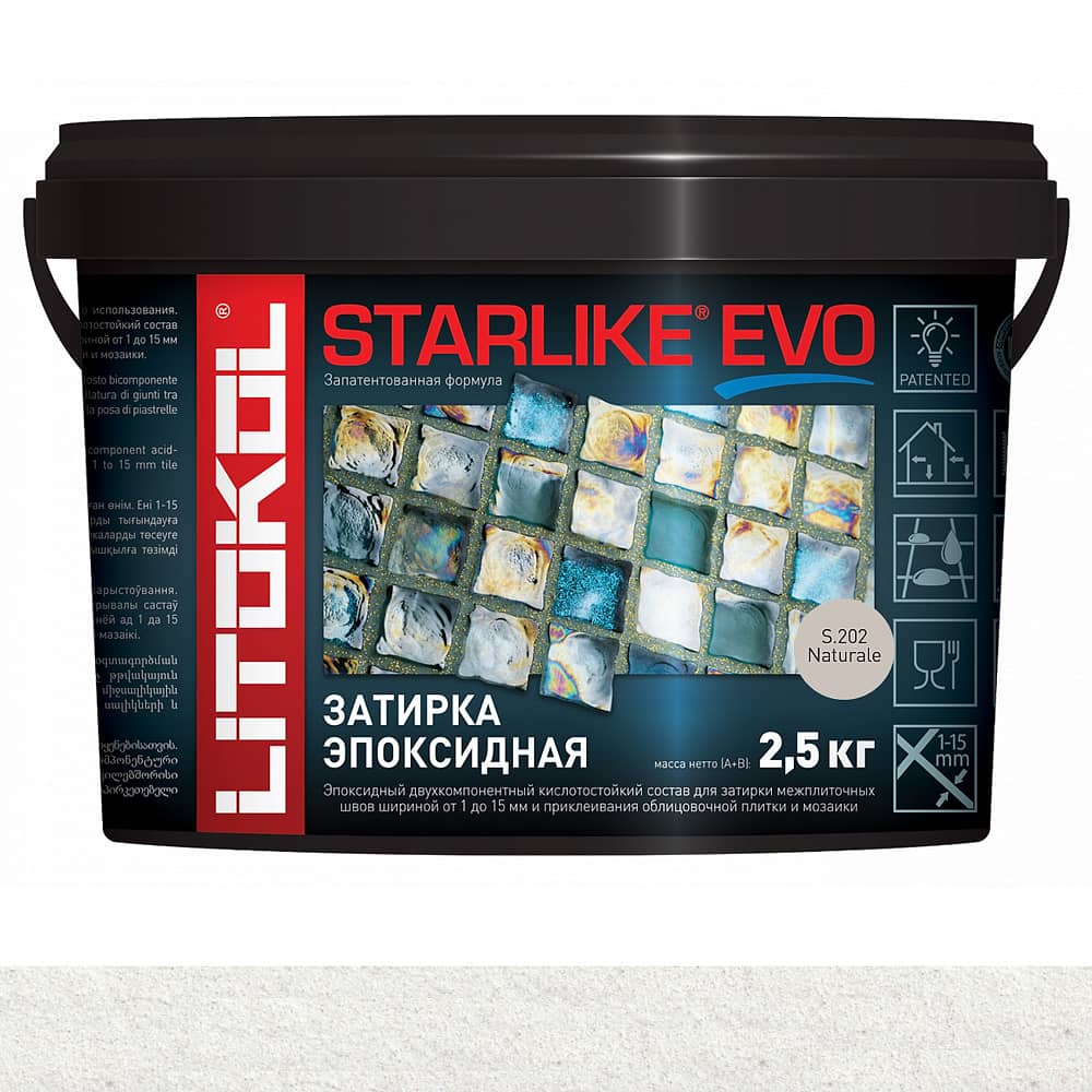 STARLIKE EVO двухкомпонентныи эпоксидныи кислотостоикии, щелочестоикии состав для затирки межплиточных швов с ширинои шва от 1 до 15 мм и использования в качестве клея для всех видов облицовочнои плитки и мозаики.