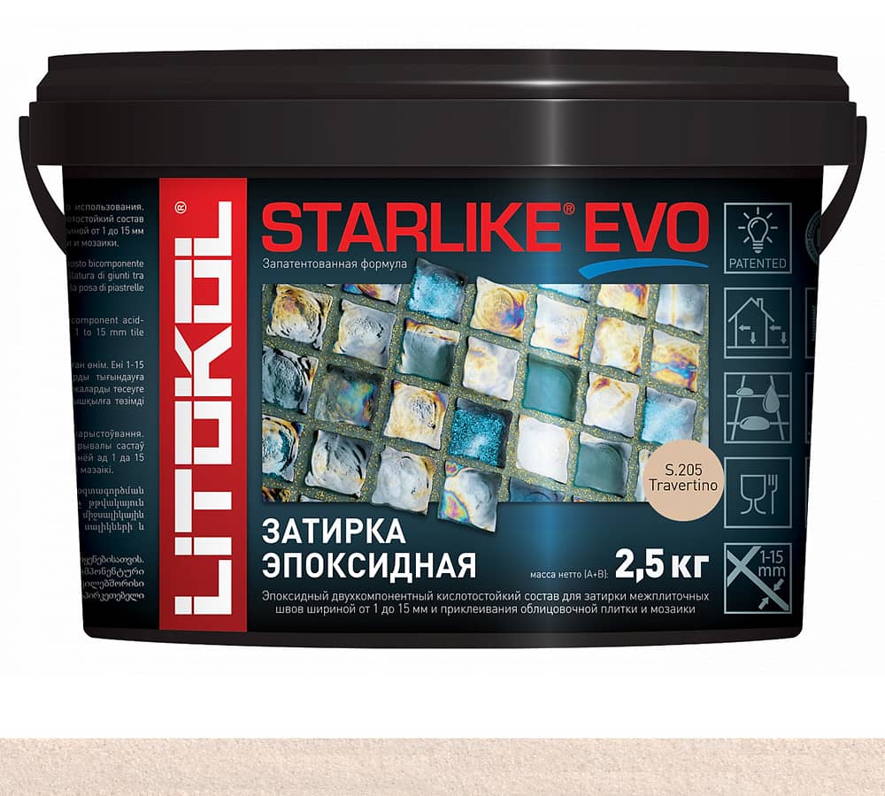 STARLIKE EVO единственная в мире запатентованная эпоксидная затирка. При нанесении STARLIKE EVO не дает эффекта прокрашивания на керамическои плитке, мозаике, плитке из натурального камня.