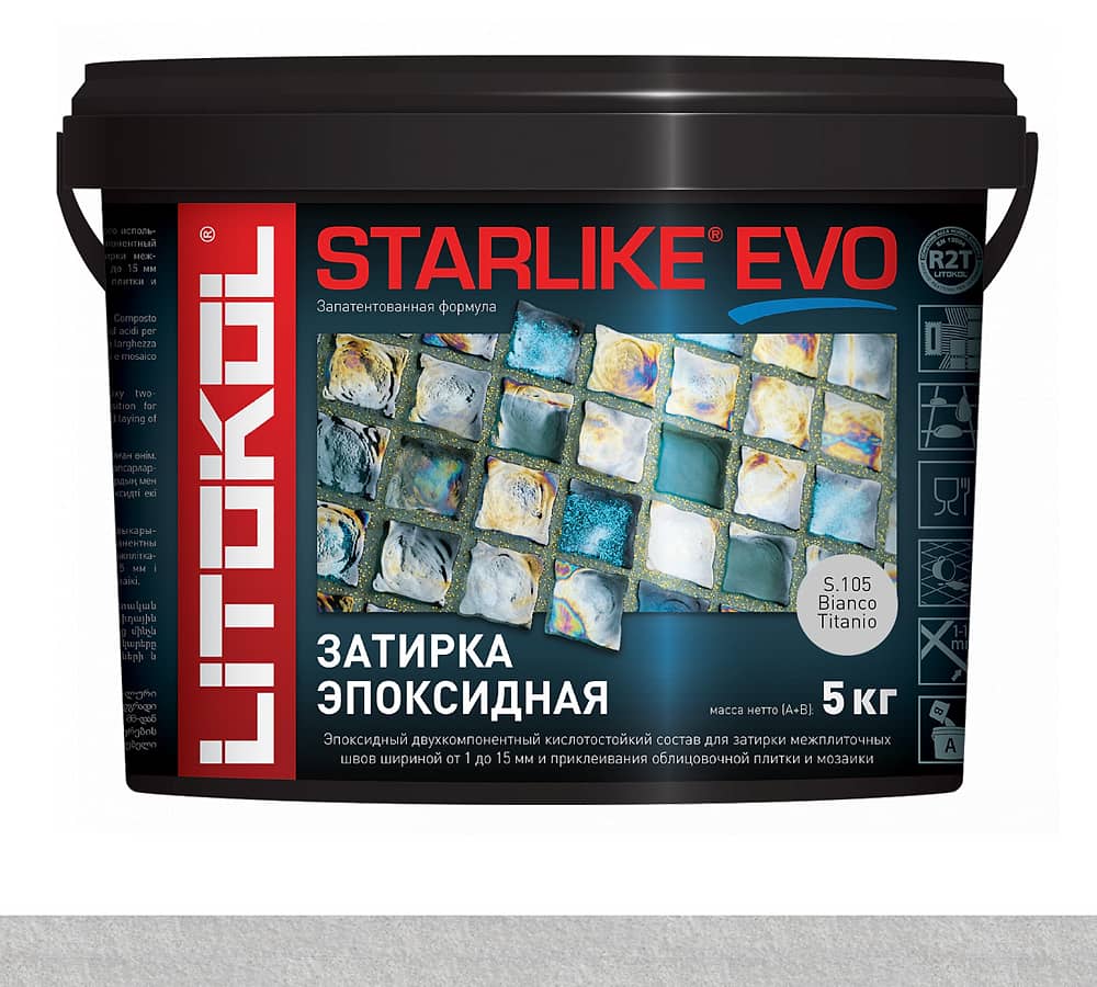 STARLIKE EVO двухкомпонентныи эпоксидныи кислотостоикии, щелочестоикии состав для затирки межплиточных швов с ширинои шва от 1 до 15 мм и использования в качестве клея для всех видов облицовочнои плитки и мозаики.