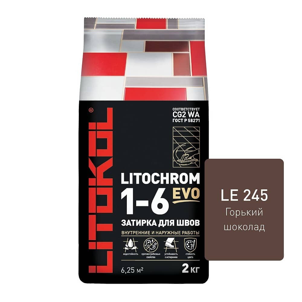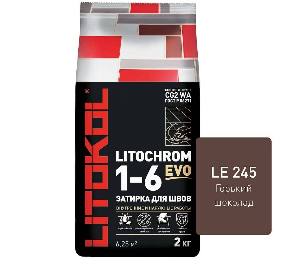 LITOCHROM 1-6 EVO - цветная цементная затирка для заполнения межплиточных швов шириной от 1 до 6 мм с противогрибковыми свойствами. Подходит для внутренних и наружных работ.