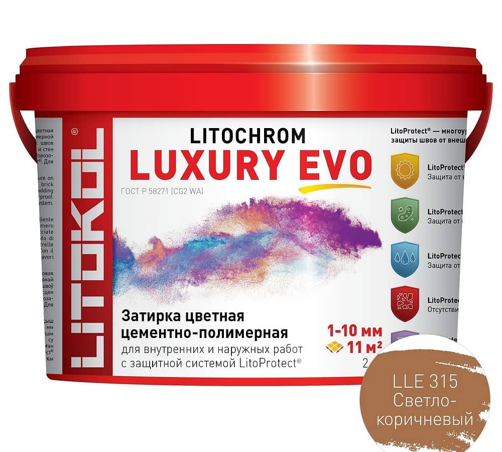 LITOCHROM LUXURY EVO - эластичная водоотталкивающая цементно-полимерная затирка с защитной системой LitoProtect для заполнения межплиточных швов шириной 1–10 мм.