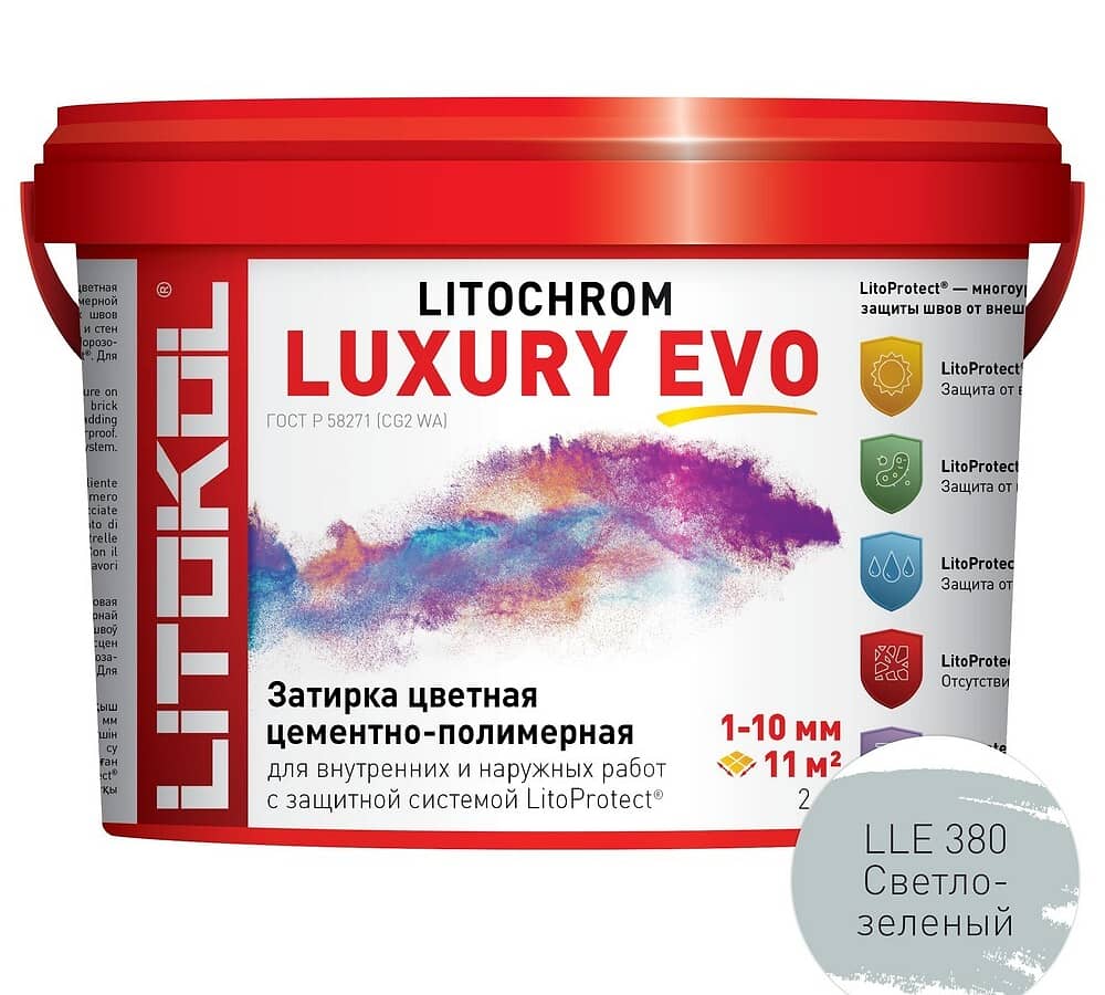 LitoProtect® AQUA — защита от воды и загрязнений. Поверхность швов обладает ярко выраженными водоотталкивающими свойствами, «эффект капли» проявляется при контакте поверхности швов с водой. Швы защищены от увлажнения, вымывания, и образования высолов, что позволяет использовать LITOCHROM LUXURY EVO при облицовке ванных, душевых, бассейнов, террас, балконов и т. д.